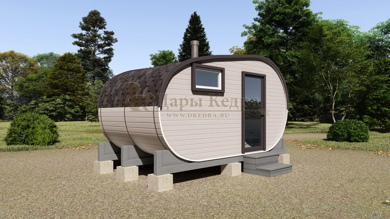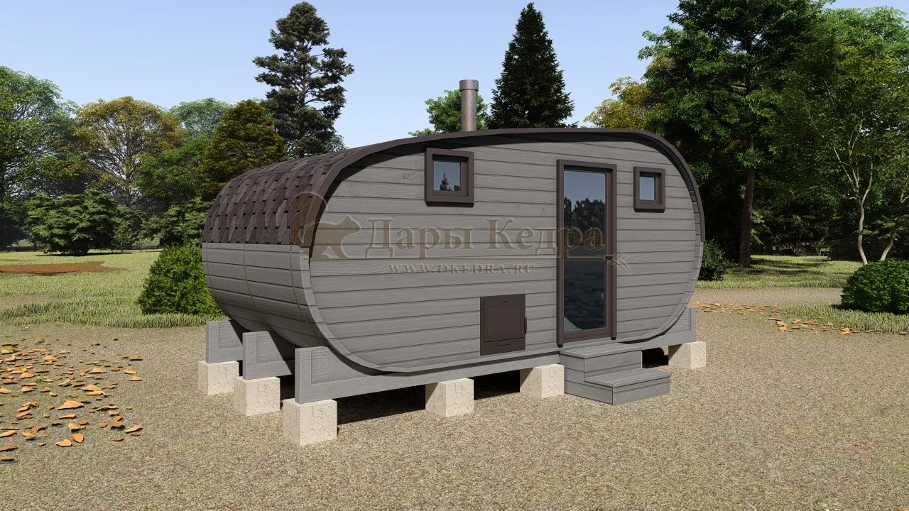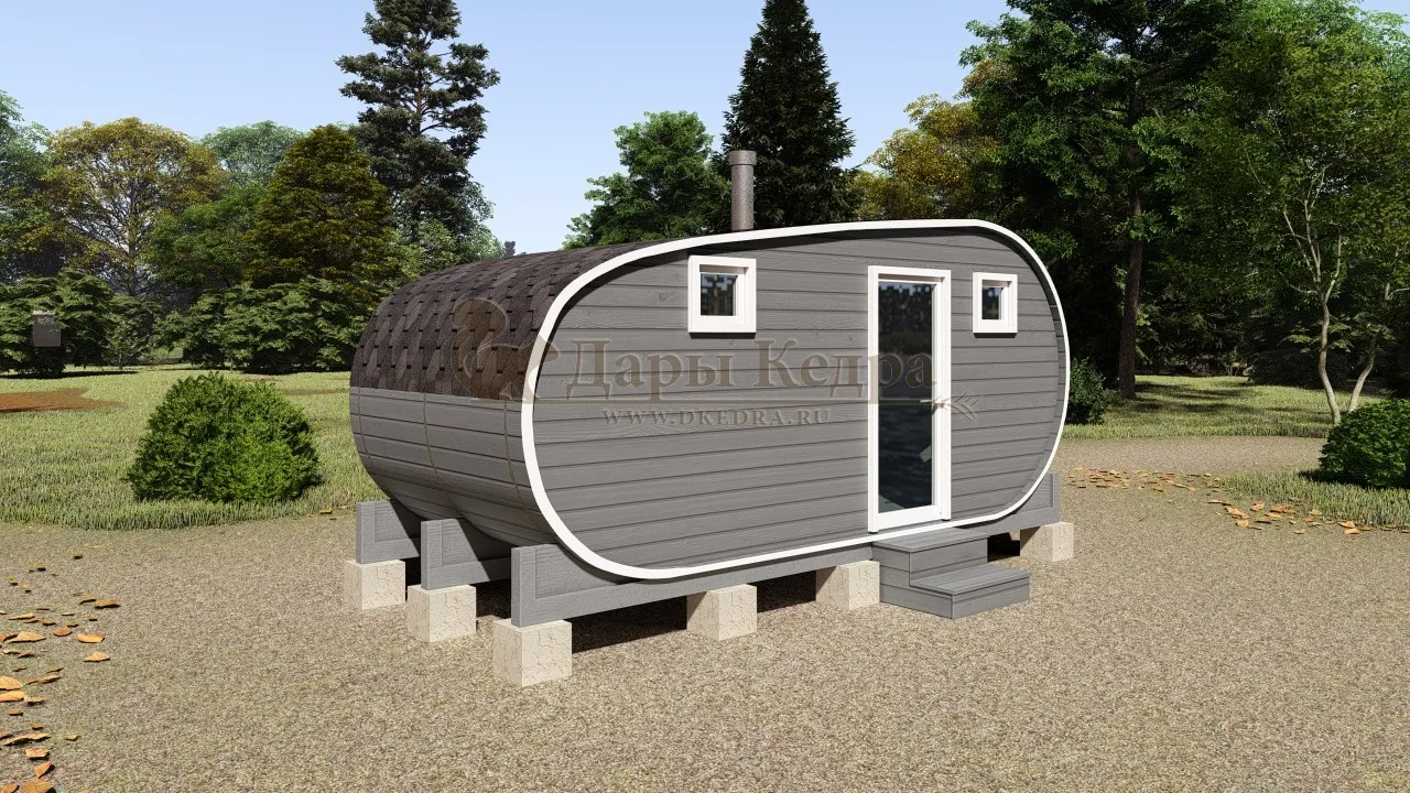 Внутри бани создается ощущение простора, позволяя разместить более широкие полки, удобные скамьи и даже полноценную комнату отдыха. Овальная форма обеспечивает более эффективное распределение пара и тепла, создавая идеальный микроклимат для парения. Возможность бокового входа также расширяет варианты планировки и установки на вашем участке.