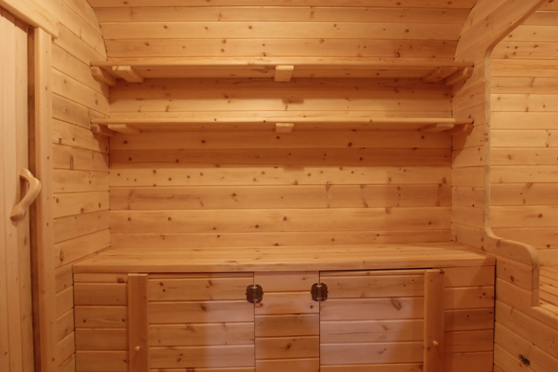 Обращаем Ваше внимание, что в стандартную комплектацию бани входит полок открытого типа в парной. Дополнительно можно заказать полок закрытого типа или лавку!