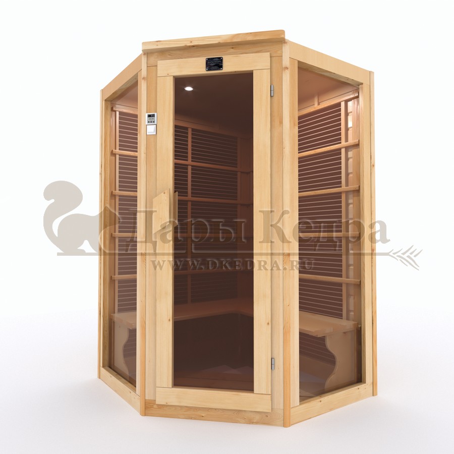 Это специально оборудованная кедровая кабина для прогрева тела человека сухим теплом. Воздух в таких парных не нагревается. Инфракрасные лучи воздействуют на тело, равномерно прогревая мышцы, суставы и органы. Карбоновые излучатели, встроенные в стены кабины, обладают мягким прогревом, что полностью исключает возможность ожога. Работает кабина за счет электричества. Установка сауны в угол, позволяет рационально использовать пространство помещения. Подходит как для домашнего использования, так и для коммерции.