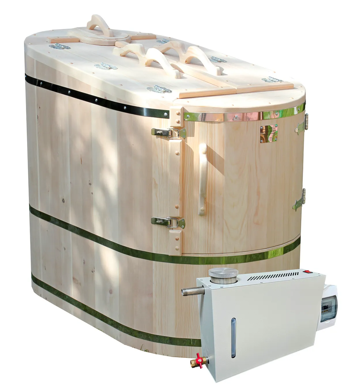 Готовый комплект «Удобный+»: кедровая бочка с парогенератором + био-защита изнутри и снаружи Готовый комплект - это полностью укомплектованный набор с фитобочкой для процедур парения. Овальная модель более просторна и удобна в использовании. Толщина стенок составляет 25 мм. Бочка оборудована откидными створками, дверцей и отверстием для головы. Верхний скос изделия делает положение головы более комфортным и улучшает обзор. Во время парения человек сидит внутри кедровой бочки, а голова находится снаружи. Благодаря этому исключается возможность перегрева. Подлокотники из кедра, встроенные ручки на створках и двери делают эксплуатацию более удобной. Парение в фитобочке благотворно влияет на организм в целом: повышается иммунитет, выводятся шлаки и токсины, улучшается работа органов тела и состояние кожи.