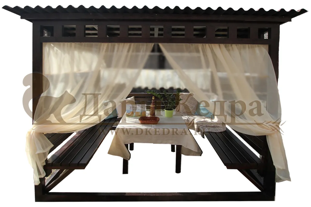 Беседка из металла Беседка выполнена из стальной квадратной профильной трубы 40х40 мм. Лавки и стол обшиты кедровой доской. На крыше - ондулин. Беседка отличается простотой в установке, легкостью конструкции, долговечностью, прочностью и классическим дизайном, который впишется в любой интерьер приусадебного участка. Вокруг такой беседки можно организовать ландшафт из вьющихся растений, которые красиво создадут зеленые 'стены' снаружи и уют внутри. Размер стола у разных моделей варьируется в зависимости от ширины конструкции.